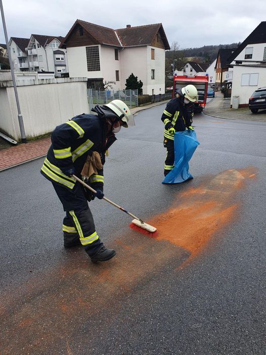 Heute Mittag wurden wir zu einer Ölspur gerufen. Wir streuten das ausgelaufene Öl ab und nahmen das Bindemittel anschließend auf.