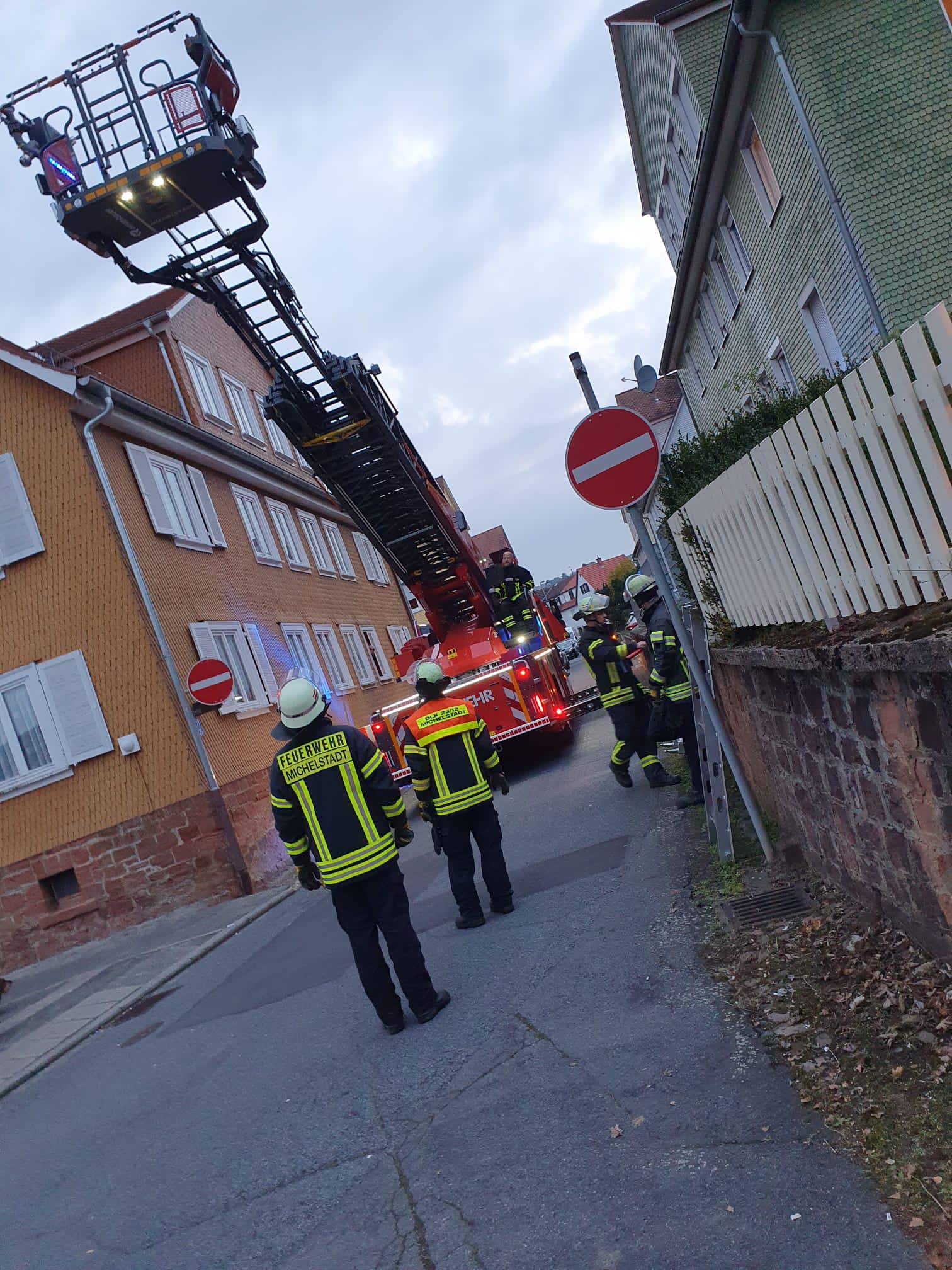 Der Rettungsdienst forderte uns zur Tragehilfe mit der Drehleiter an. Da die Person nicht über unsere Drehleiter gerettet werden konnte, forderten wir daher die Drehleiter der Freiwilligen Feuerwehr Michelstadt nach. Deren Drehleiter verfügt über neue technische Möglichkeiten und kann ein größeres Patientengewicht tragen.