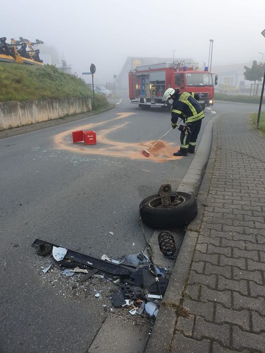 Heute wurden wir anders geweckt : Nach einem Verkehrsunfall galt es, die Straße zu reinigen. Wir nahmen ausgelaufene Betriebsmittel auf, beseitigten Trümmerteile und stellten Warnschilder auf.